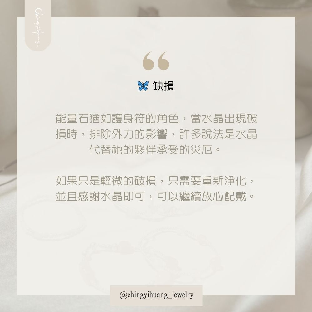 🦋2.缺損:能量石猶如護身符的角色,當水晶出現破損時,排除外力的影響,許多說法是水晶代替祂的夥伴承受的災厄。如果只是輕微的破損,只需要重新淨化,並且感謝水晶即可,可以繼續放心配戴。