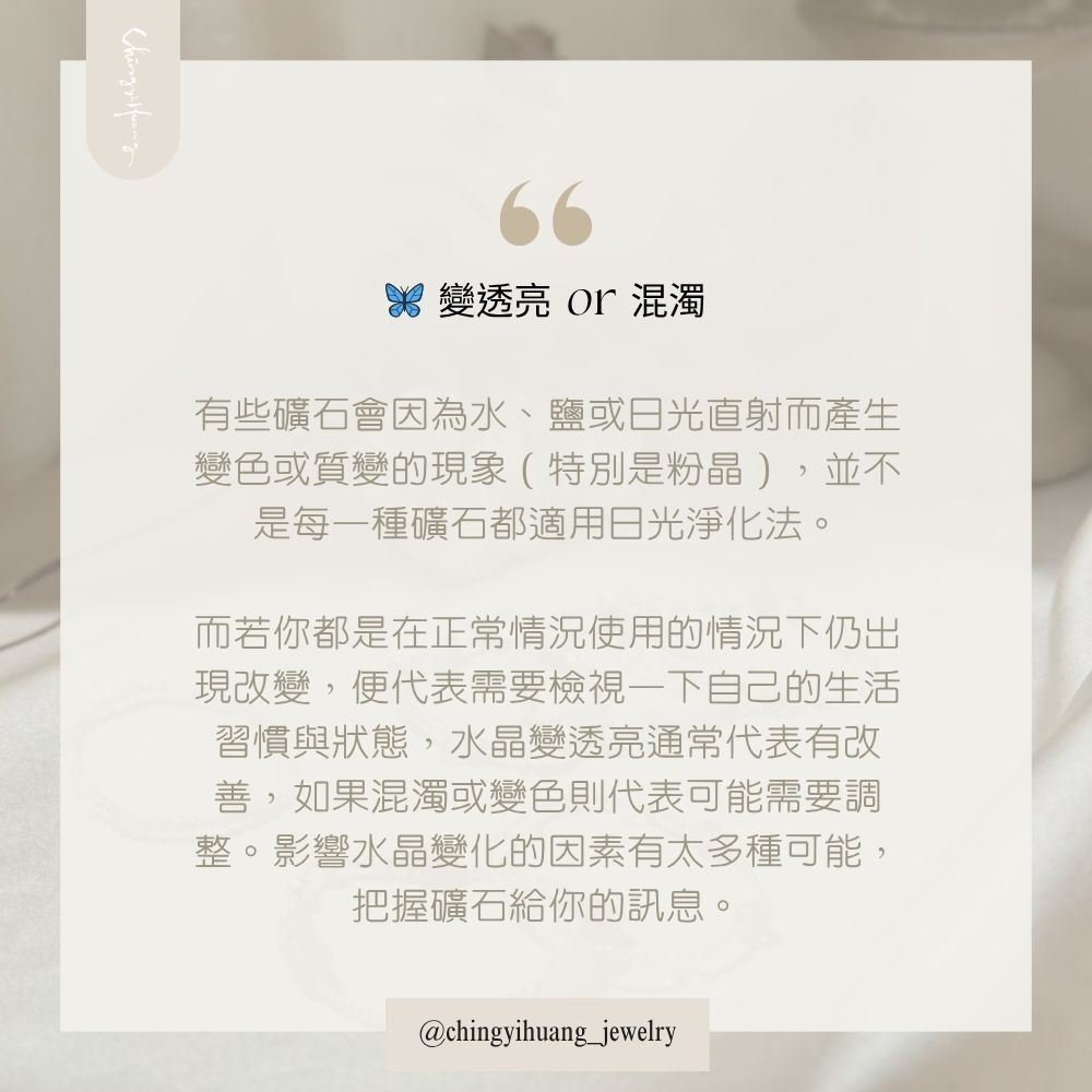 🦋1. 變透亮/混濁:有些礦石會因為水、鹽或日光直射而產生變色或質變的現象(特別是粉晶),並不是每一種礦石都適用日光淨化法。而若你都是在正常情況使用的情況下仍出現改變,便代表需要檢視一下自己的生活習慣與狀態,水晶變透亮通常代表有改善,如果混濁或變色則代表可能需要調整。影響水晶變化的因素有太多種可能,把握礦石給你的訊息。