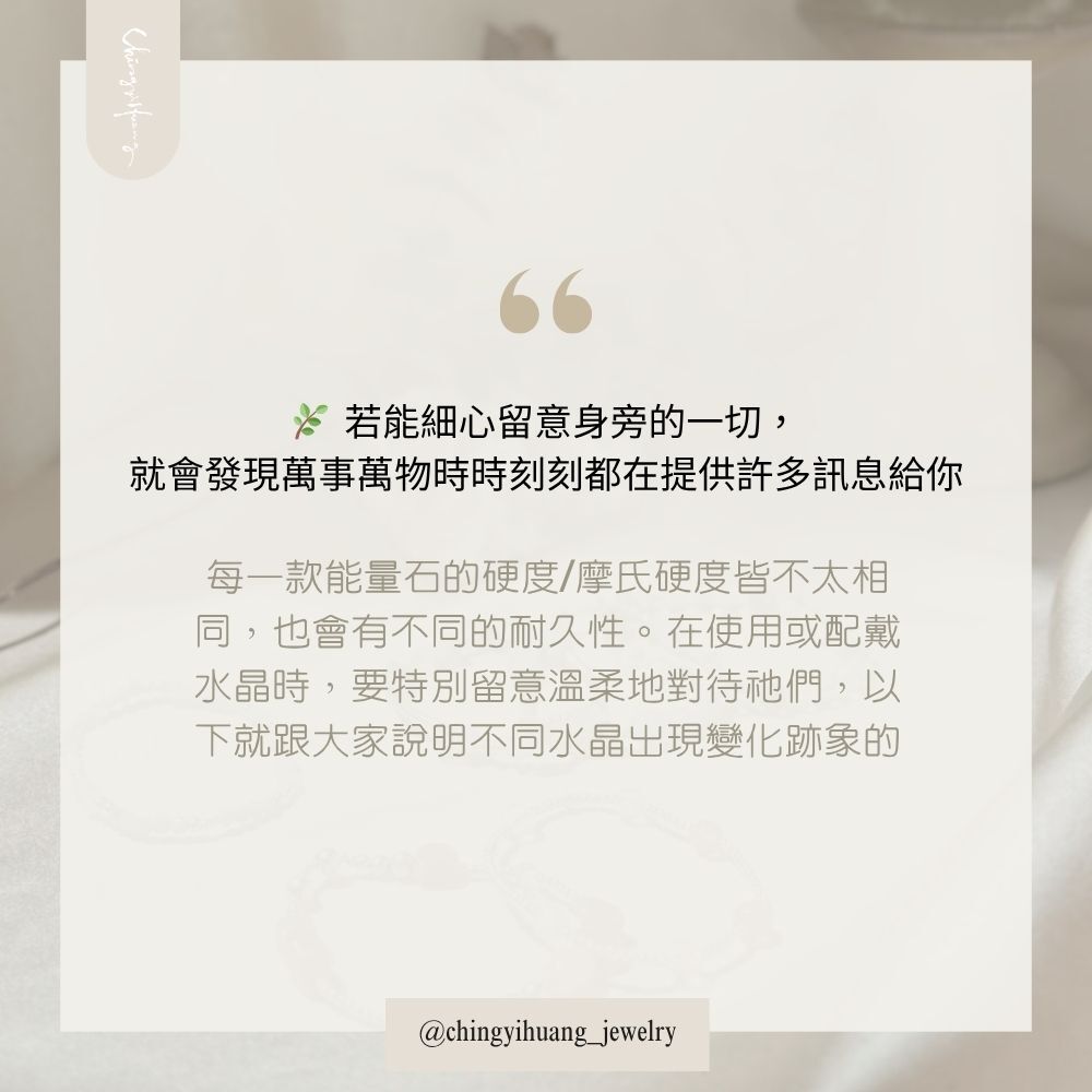每一款能量石的硬度/摩氏硬度皆不太相同,也會有不同的耐久性。在使用或配戴水晶時,要特別留意溫柔地對待祂們,以下就跟大家說明不同水晶出現變化跡象的原因與處理方法: