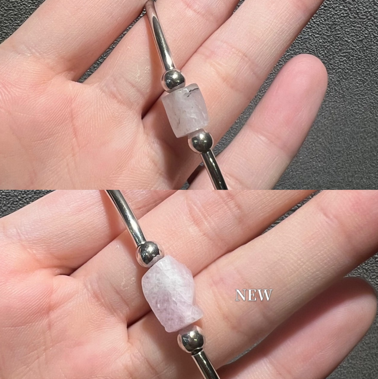 搭配的是紫鋰輝 原礦穿孔,保留原始面貌,因此每一顆都是獨一無二,會有缺損與痕跡,可以接受再購買。