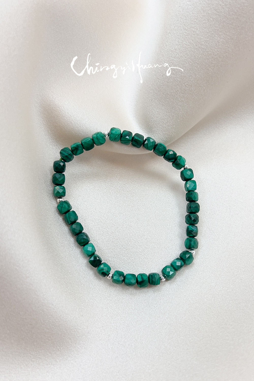 CYH- 天然 孔雀石 純銀 彈性繩 手環(去除內心負面想法/反擊邪惡力量/身體健康/對應心輪 )
